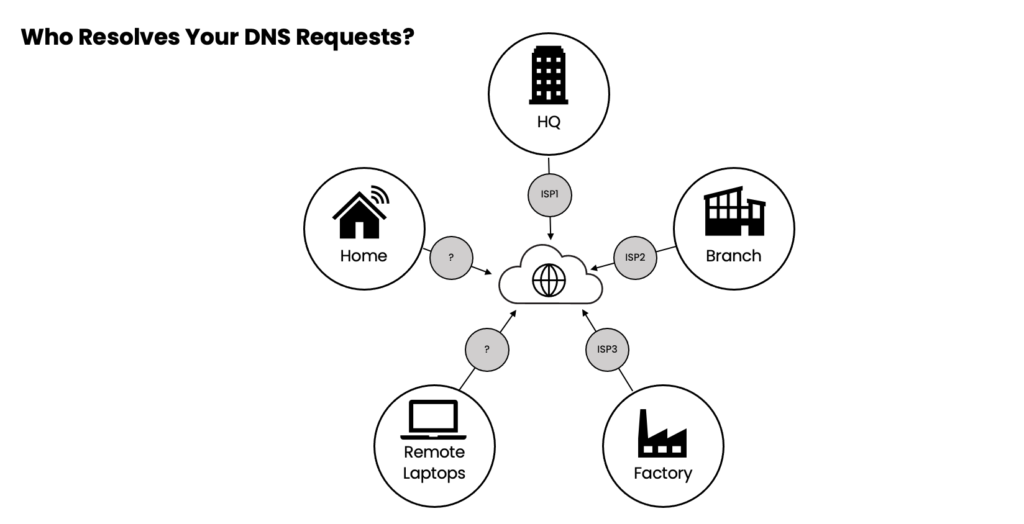 Using different resolvers at multiple locations may create security issues. Some businesses may attempt to address this issue through the use of a VPN, but as we all know, employees frequently forget to turn the VPN on due to performance issues. We all do it, but we don’t tell anyone, which causes problems.